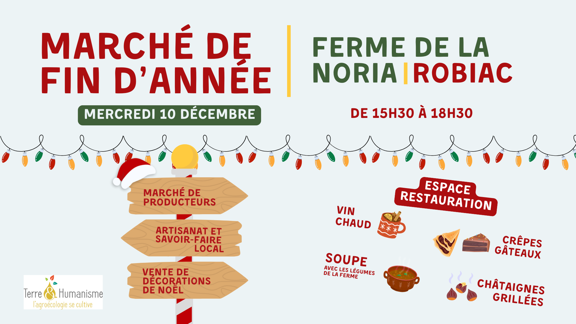 Mercredi 10 décembre de 15h à 18h30, la ferme de la Noria invite différents producteurs et artisans de la région à venir vendre leurs produits sur la ferme. Légumes, œufs, pain, miel, châtaignes, bières, seront notamment disponibles à la vente. Il y a aura également des stands de bijoux et créations d’artisans. Enfin, il sera possible de manger une soupe, des crêpes et de boire un verre sur place. Tout cela dans une ambiance musicale. C’est aussi une occasion de venir échanger avec l’équipe de Terre & Humanisme.